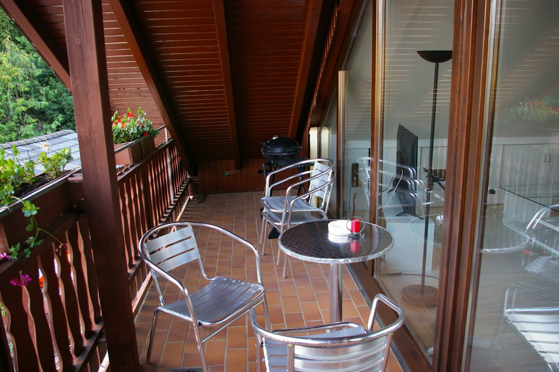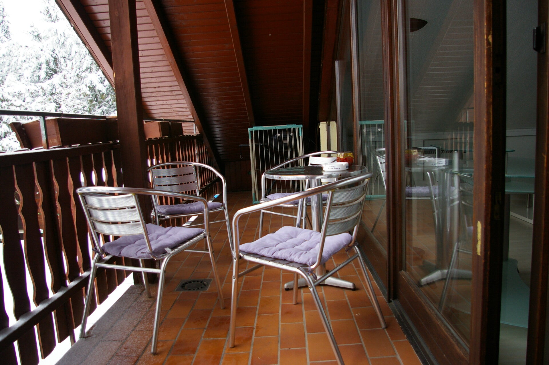Impressionen vom Balkon mit kleinem Tisch und vier Stühlen.