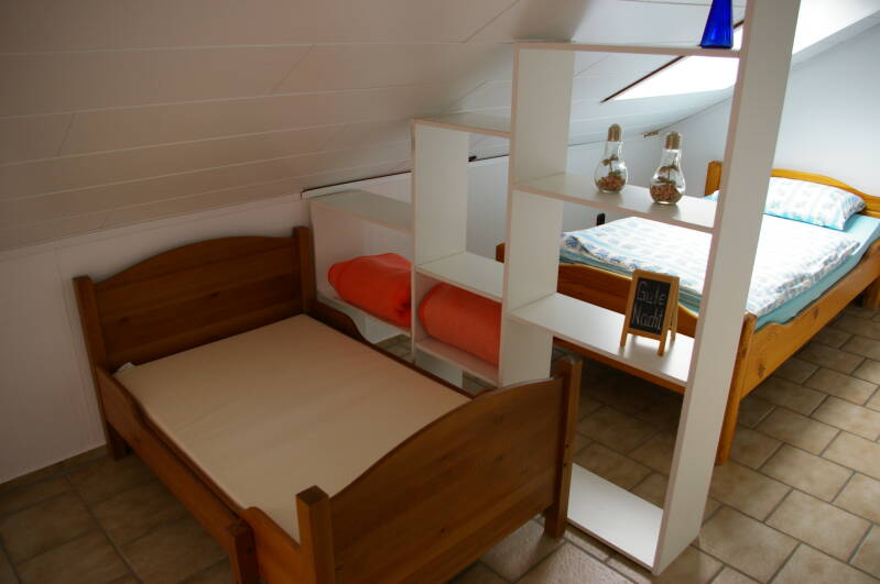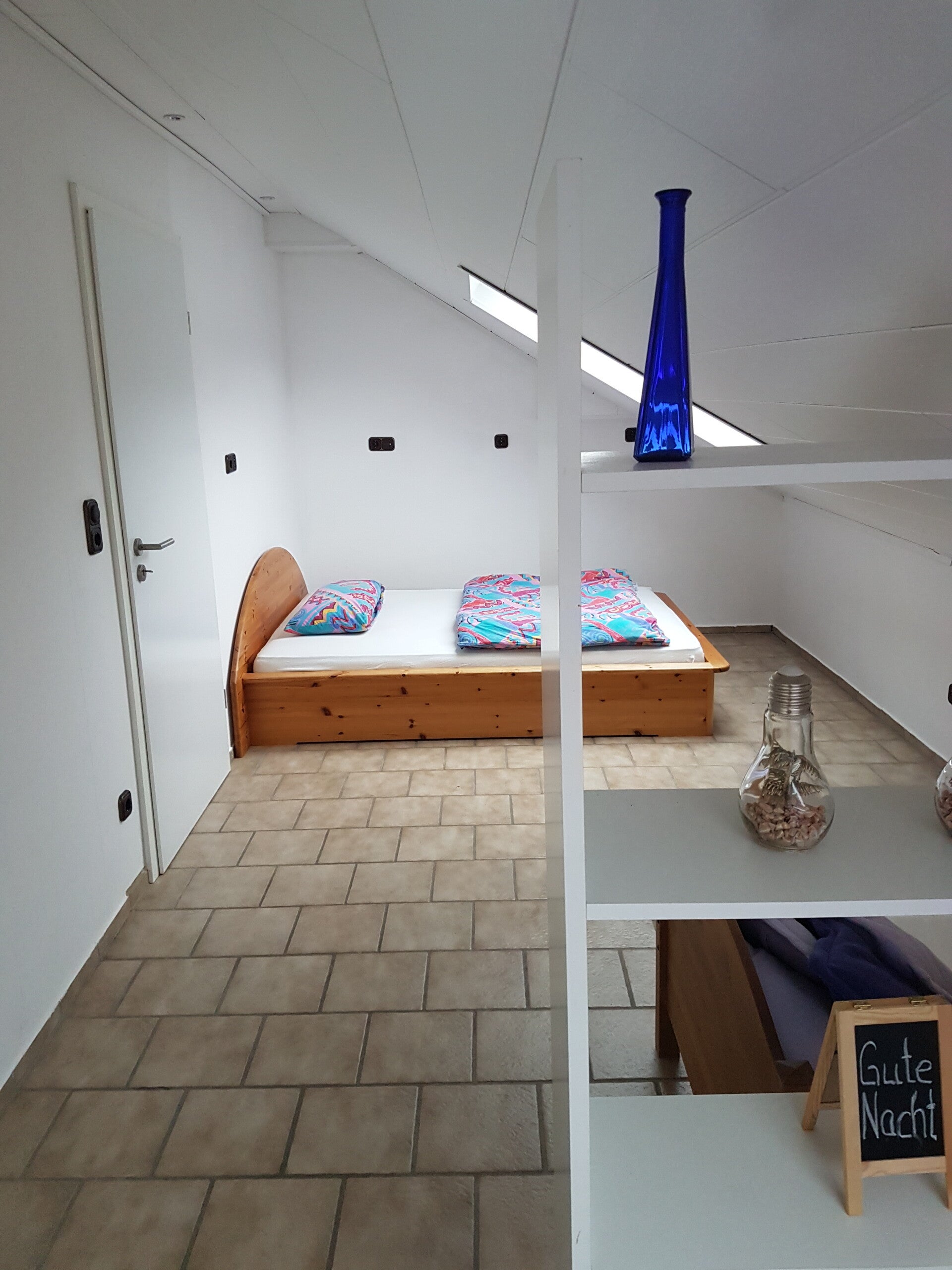 Doppelbett im Schlafraum unter der Schräge und unter dem Dachfenster