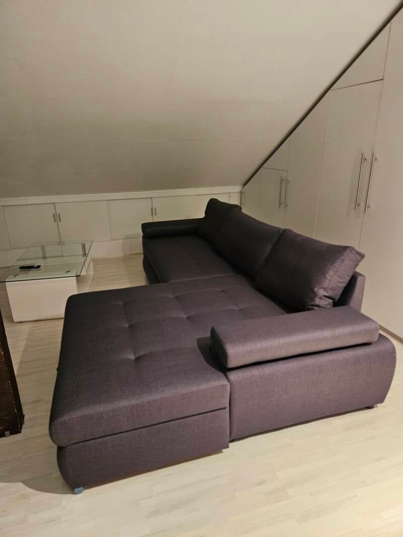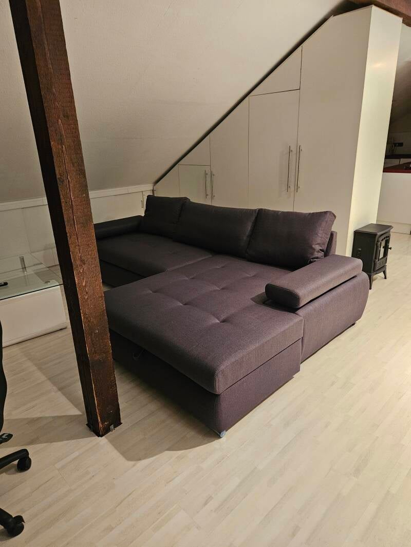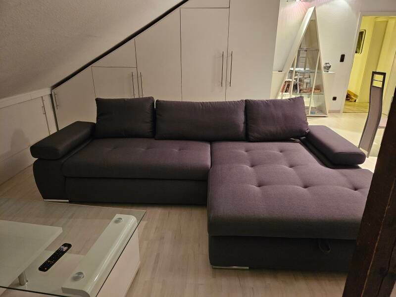 Das Ecksofa lässt sich ausziehen, so dass ein Doppelschlafplatz entsteht.