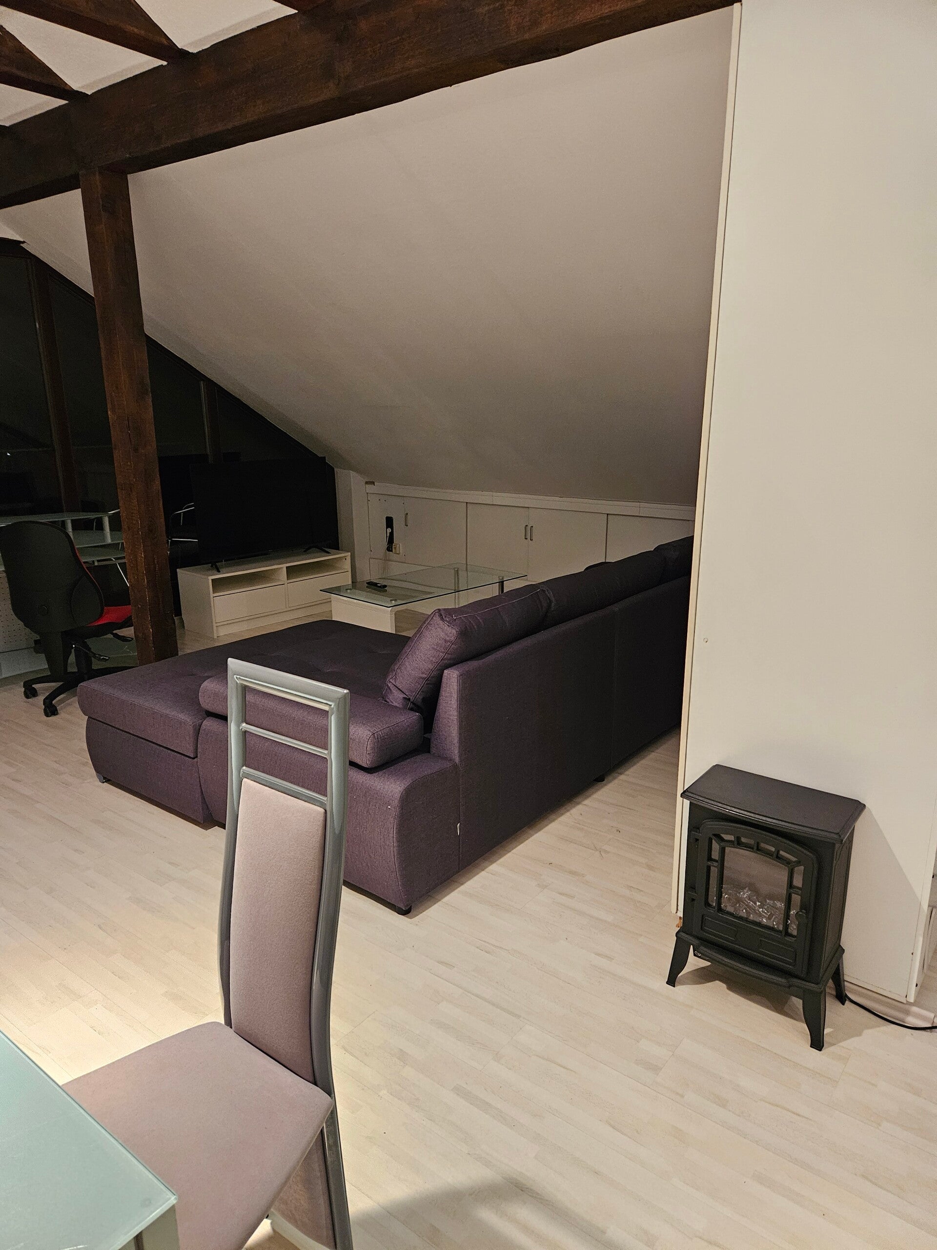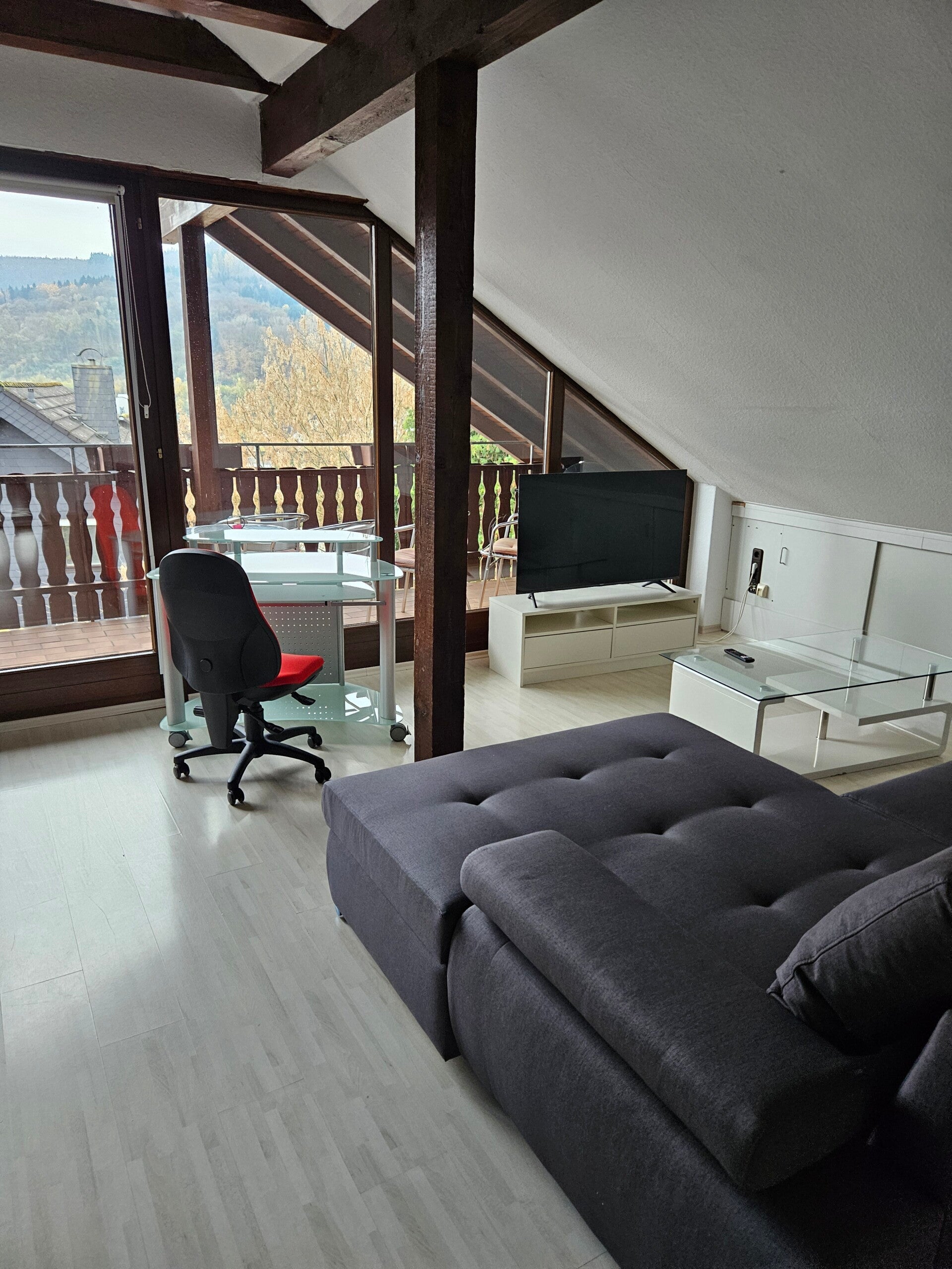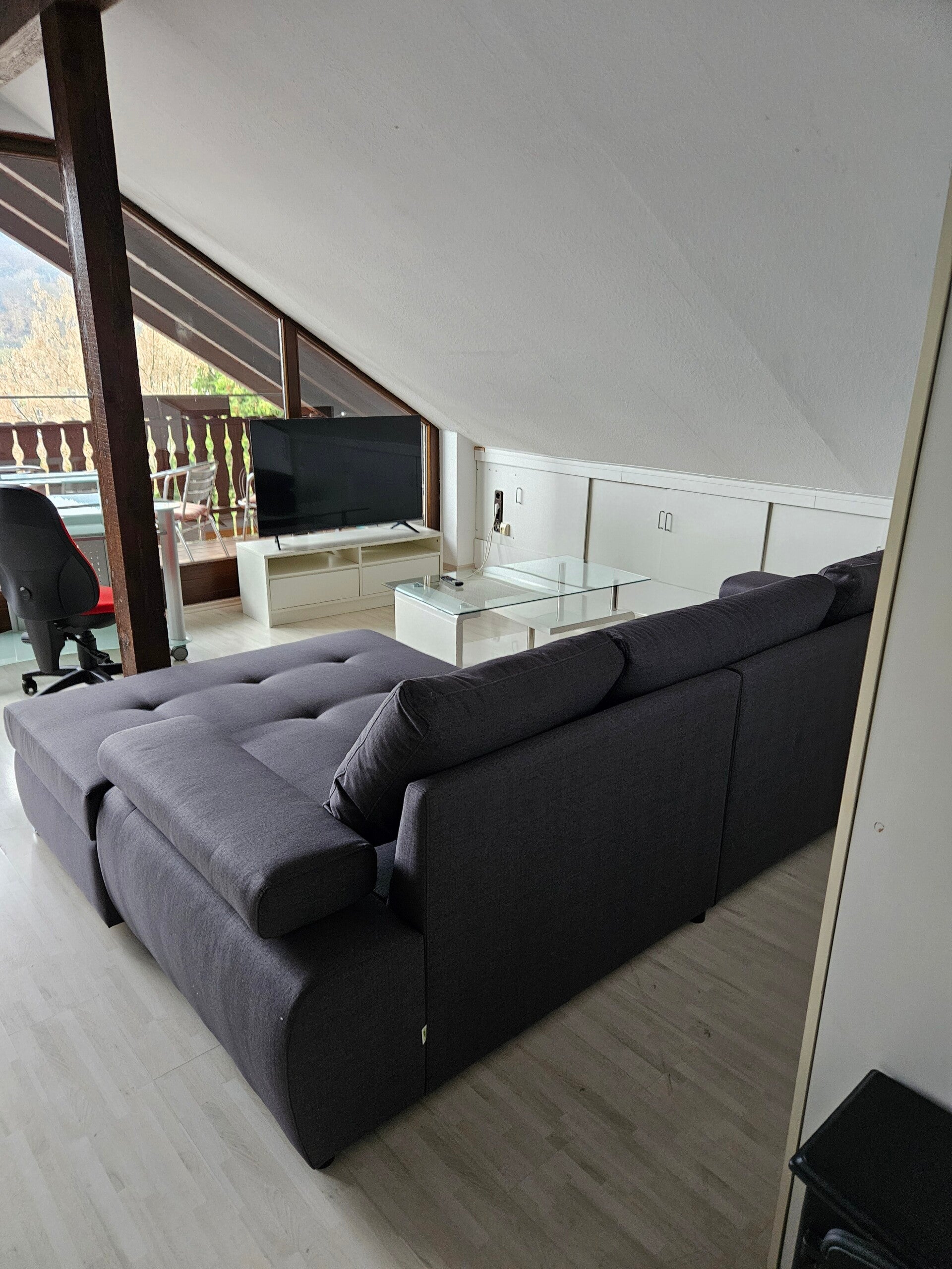 Wohnbereich mit Ecksofa, Tisch und Fernseher und Arbeitsplatz.